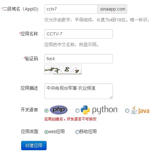 填寫二級域名AppID、應用名稱、驗證碼,開發語言選擇PHP,應用類型選擇web應用。然後點擊創建應用