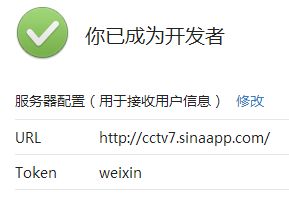 此處的URL為上篇中介紹的雲應用的域名,而Token在index.php中定義為weixin。提交後提示你已成為開發者。