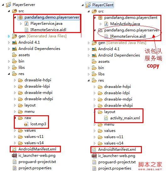 新建一個android application project,命名為PlayerClient。將服務端放有aidl文件的包直接copy到客戶