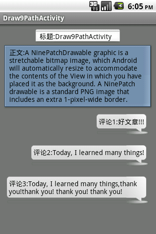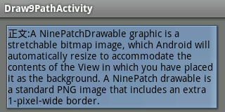 11 android:text="正文:A NinePatchDrawable graphic is a stretchable bitmap image, which Android will automatically resize to accommodate the contents of the View in which you have placed it as the background. A NinePatch drawable is a standard PNG image that includes an extra 1-pixel-wide border."