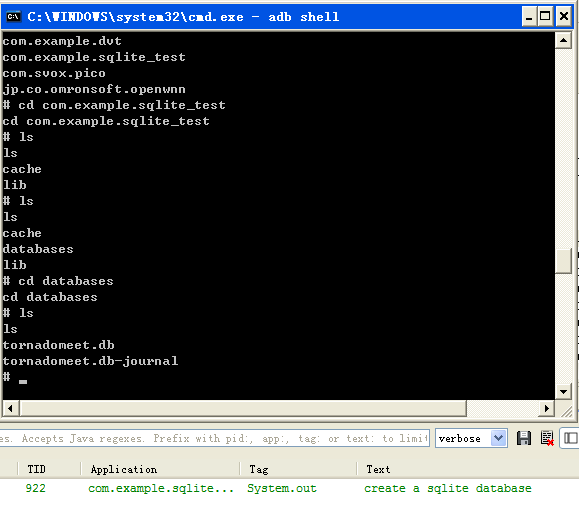運行模擬器,單擊create sqlite database按鈕,創建一個名為”tornadomeet”的數據庫,版本號為1,這時候可以看到程序終端顯示”create a sqlite database”字樣。在cmd中輸入如下命令:adb shell;cd data; cd data; ls; cd com.example.sqlite_test; ls;命令,其中com.example.splite是本程序的包名,輸入最後ls命令後可以看到有2個文件夾cache, lib。然後在單擊後繼續ls命令查看,多了一個database文件夾。使用命令cd database進入該文件夾後ls發現裡面有數據庫,截圖如下:
