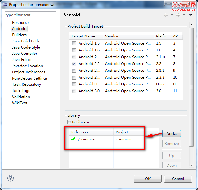 第四步: 右鍵tianxianews,選擇Properties,在Android標簽頁,點擊Add,選中common。如下圖。