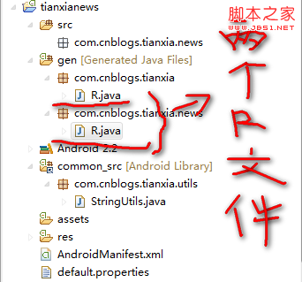 eclipse為了生成了兩個R.java,一個是common工程的,一個tianxianews工程的,但是內容是一摸一樣的,這樣做的好處是:R.java裡面的內容包括兩個工程資源,第一,tianxianews工程通過R.java能調用到common工程的資源;第二,如果有覆寫的資源,生成apk的時候,tianxianews工程覆蓋common工程的資源,因為兩個R.java內容一樣,common代碼調用的R.java中的資源,實際上調用的是tianxianews資源,這個特性類似如面向對象的繼承的概念。