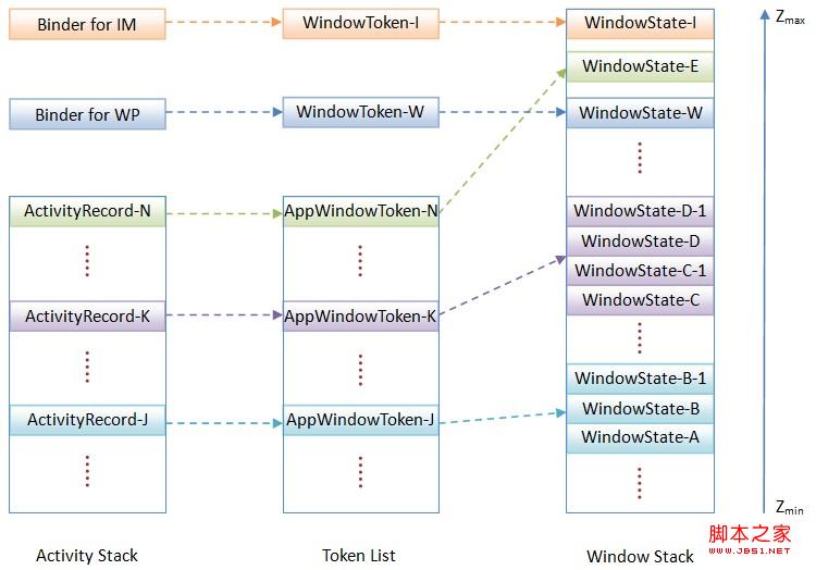 1. WindowManagerService服務維護有一個AppWindowToken堆棧和一個WindowState堆棧,它們與ActivityManagerService服務維護的Actvity堆棧是有關相同的Z軸位置關系的。