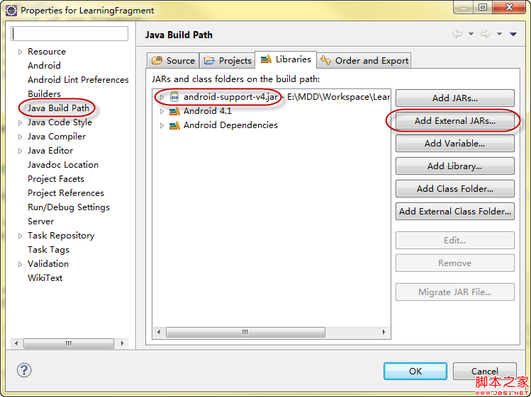 同時應該將上述的包拷入libs項目下的libs文件夾,然後在項目的Properties中添加:右鍵單擊項目,選Properties,左邊選Java Build Path,然後Add External JARs…,添加android-support-v4.jar.