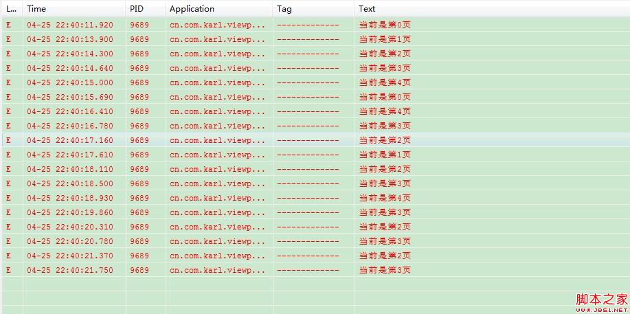 忘記了,這種效果不太好用圖片演示,大家自己演示吧!滑動到最後一張,再滑動就是進入了第一頁。下面看下我logcat下的打印: