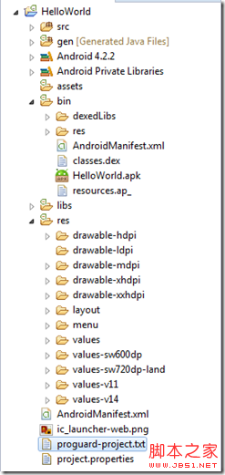 HelloWorld的目錄結構有: src:存放應用程序的邏輯代碼,這裡面的代碼是人工寫的gen:存放資源代碼,這裡面的代碼是自動生成的assets:存放mp