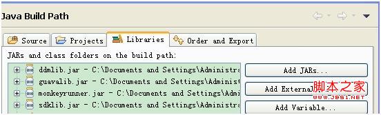 開始時,搜素到一些零碎的教程,說使用java調用monkeyrunner時,需要導入android sdk tools路徑下的lib裡面的4個包:ddmlib.jar,guavalib.jar,monkeyrunner.jar,sdklib.jar.當然,這裡建的是java工程,往工程裡面導包就是通過:右鍵工程》properties》Java Build Path》Libraries》add External JARs》OK。如下圖: