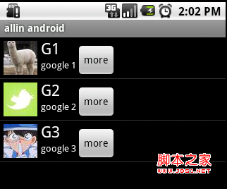 但是有時候,列表不光會用來做顯示用,我們同樣可以在在上面添加按鈕。添加按鈕首先要寫一個有按鈕的xml文件,然後自然會想到用上面的方法定義一個適配器,然後將數據映射到布局文件上。但是事實並非這樣,因為按鈕是無法映射的,即使你成功的用布局文件顯示出了按鈕也無法添加按鈕的響應,這時就要研究一下ListView是如何現實的了,而且必須要重寫一個類繼承BaseAdapter。下面的示例將顯示一個按鈕和一個圖片,兩行字如果單擊按鈕將刪除此按鈕的所在行。並告訴你ListView究竟是如何工作的。效果如下:
