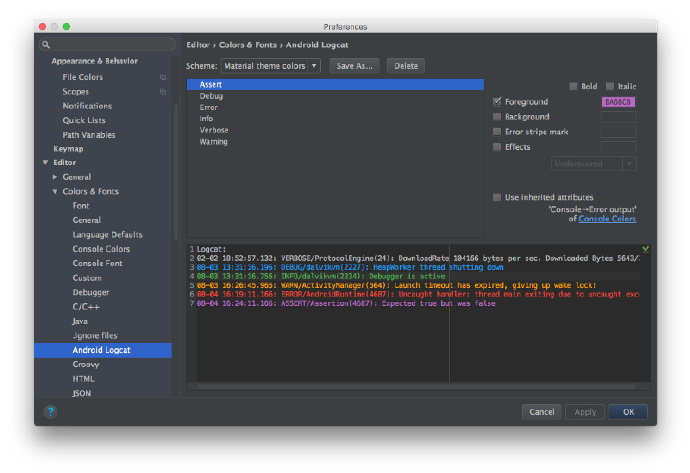 要更改Android Studio Logcat,您需要依次點擊:Preferences → Editor → Colors & Fonts → Android Logcat,然後更改每種類型日志的前景顏色。(注意,此處Perferences在Windows / Linux 是Settings。)