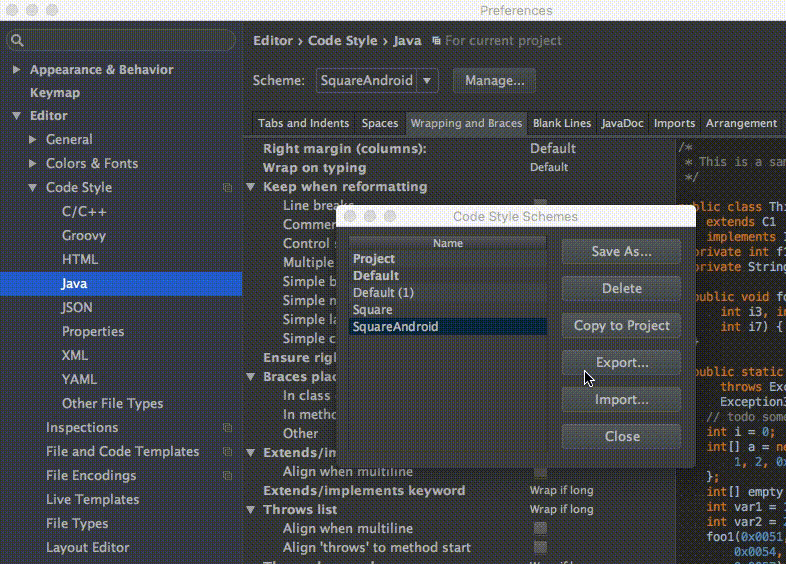 依次點擊Preferences → Code Style → Java,在Scheme下拉列表中選擇您的代碼樣式(或設置一個新的代碼樣式)。