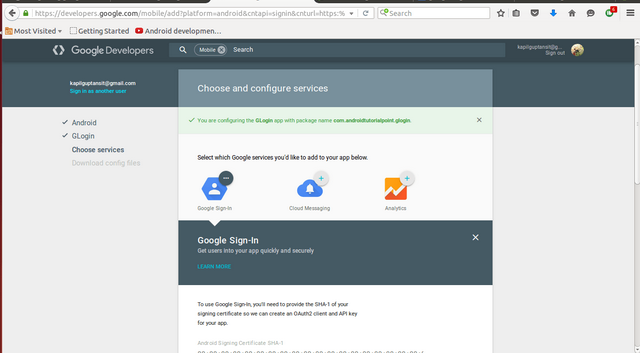 配置文件可為你的app提供特定的服務信息。轉到谷歌開發者頁面。為此,你必須為你的app選擇現有項目或創建一個新的項目。你還需要為你的app提供軟件包名稱。
