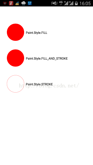 這個類可以畫幾何圖形,文本和bitmap。由於這個類的native方法和@hide方法比較多,這裡就挑一些在工作中可能常用到的方法來講解。先來看一下Paint的style,共有3種