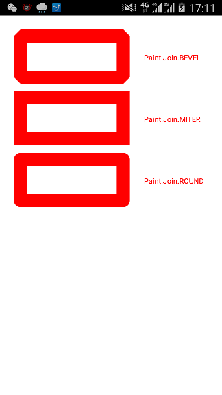左上角的沒有設置setStrokeMiter,右上角setStrokeMiter(2.3f),左下角setStrokeMiter(1.7f),右下角setStrokeMiter(0f)