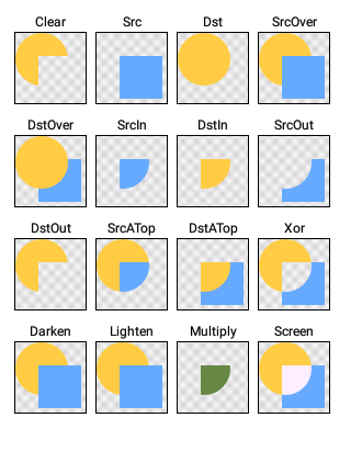 下面是我運行目錄D:\Android\adt-bundle-windows\sdk\samples\android-20\legacy\ApiDemos\src\com\example\android\apis\graphics\Xfermodes類的結果