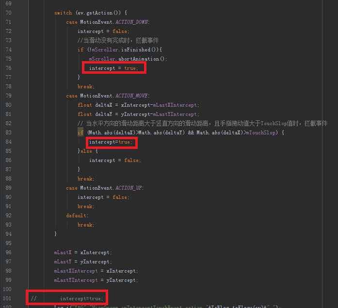 這裡把使用的示例恢復到初始狀態,然後把我在ParentView#onInterceptTouchEvent方法,switch內的兩個注釋掉的intercept = true;代碼進行恢復,最後部分intercept = true;再次注釋掉。