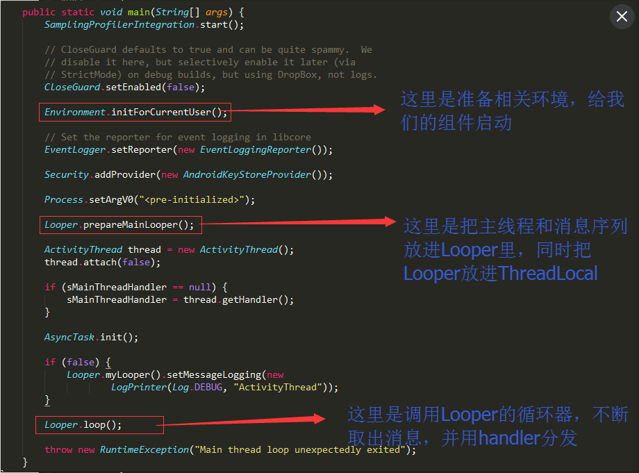 ActivityThread:程序的啟動入口,為什麼要介紹這個類,是因為該類就是我們說的主線程,它對Looper進行操作的。