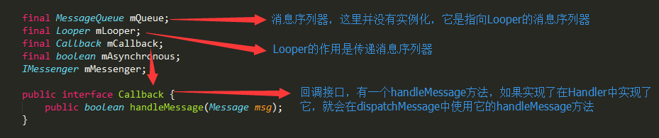 Handler:字面意思是操控者,該類有比較重要的地方,就是通過handler來發送消息(sendMessage)到MessageQueue和 操作控件的更新(handleMessage)。handler下面持有這MessageQueue和Looper的對象。