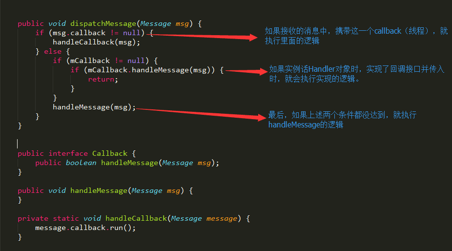 接著,我們要進入Handler.dispatchMessage()方法,因為我們要解釋上面剛剛Looper.loop方法。dispatchMessage的方法很簡單,只有三個方向,其源碼為: