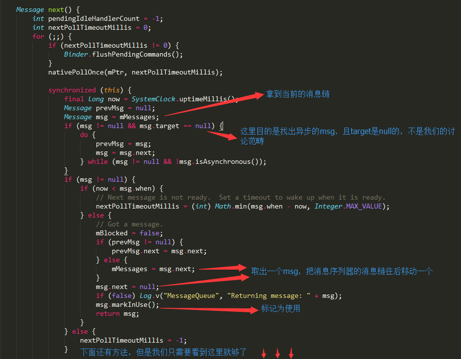 這個是發送消息的最終執行代碼,就是把消息放進消息序列器。在Looper.loop()方法中,我們是需要不斷從消息序列器中取出消息的。其過程也是我們可以進去MessageQueue.next()的源碼中看看: