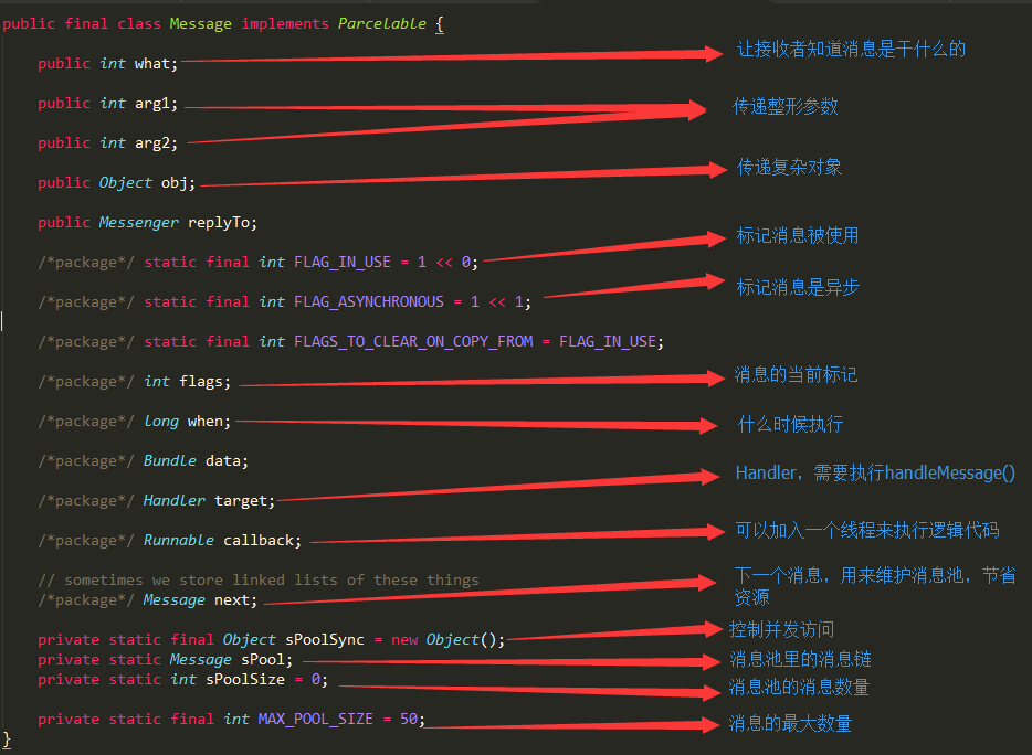 這樣,整個過程就完成了。在這些執行過程中,Message是它們的物件。我們可以看看Message的結構: