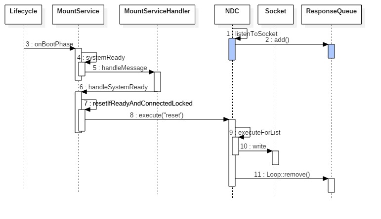 NotificationManagerService依賴於MountService,比如media/usb通知事件,所以需要先啟動MountService。此處MOUNT_SERVICE_CLASS=com.android.server.MountService$Lifecycle.