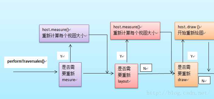 整個View樹的繪圖流程是在ViewRoot.Java類的performTraversals()函數展開的,該函數做的執行過程可簡單概況為根據之前設置的狀態,判斷是否需要重新計算視圖大小(measure)、是否重新需要安置視圖的位置(layout)、以及是否需要重繪 (draw)