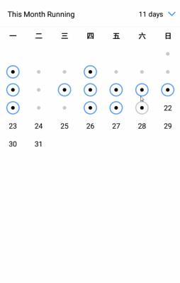 先介紹一下兩種mode,CalendarView提供了兩種模式,第一種普通日歷模式,日歷每個位置簡單顯示了day這個數字,第二種本月計劃完成情況模式,繪制了一些圖形來表示本月的某一天是否完成了計劃(模仿自悅跑圈,用一個圈表示本日跑了步)。