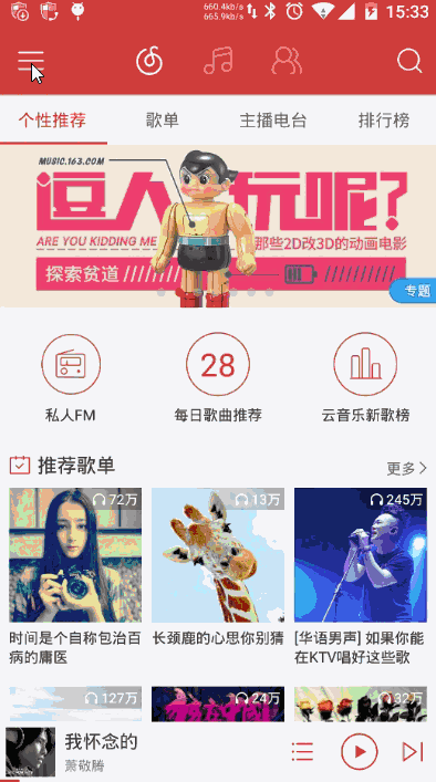 以上關於 NavigationView 不實用,僅是本人的一些看法,如果你有不同看法,歡迎留言討論。為了加深一下 NavigationDrawer 設計的實踐,下面來大致的模仿實現網易雲音樂的導航效果。