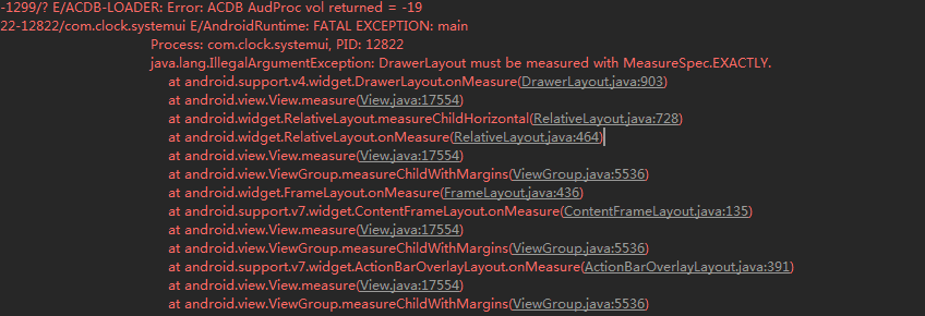具體詳細代碼請參加工程中的 SimpleDrawerActivity,此處就不貼代碼了。還有一處 DrawerLayout 使用的小細節需要溫馨提醒一下,有一次,我手誤把 DrawerLayout 的 android:layout_width 設置成 wrap_content ,就出現下面的異常了
