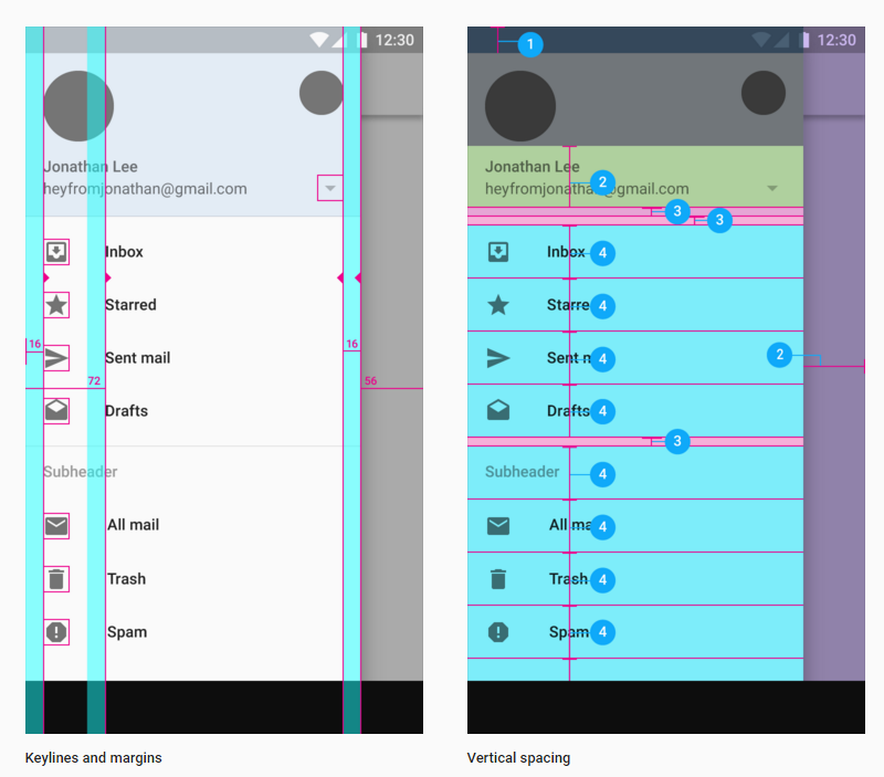 其次,是關於菜單相中圖標大小和文字間距之類的設置,從 Google 的設計文檔來看,
