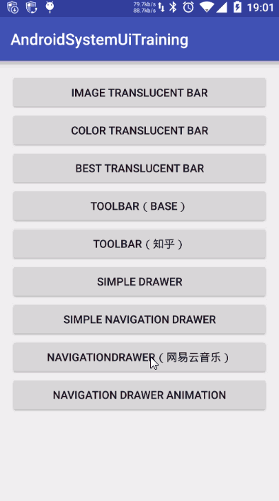而現在再也不需要了,Google 推出的 ActionBarDrawerToggle 也能實現這樣的效果了,具體查看我在 NavigationDrawerAnimationActivity 中的實現代碼