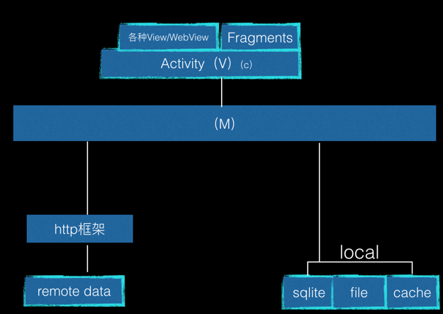 M:業務邏輯層劃分出來專門處理數據。例如:數據的http請求,數據解析和儲存等邏輯都封裝在這一層。Activity 不直接和Http,Dao(數據訪問對象層)直接有聯系了,視圖數據從此為路人。
