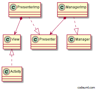 很多時候視圖層面還是充斥中很多復雜的邏輯,例如UI事件的響應處理,網絡響應的回調等等,充斥著各種監聽器的回調。我們期望視圖V便當更簡單、更純粹,V只負責繪制和刷新其他邏輯都不用管了,也不想和M有直接的聯系。從MVC的VC(Activity)中我們分離一層出來叫做Presenter,由它來負責調度UI何時刷新、由它來接受UI的事件響應並傳達指令給M。從此V和M是路人,V和數據的距離跟遠了。