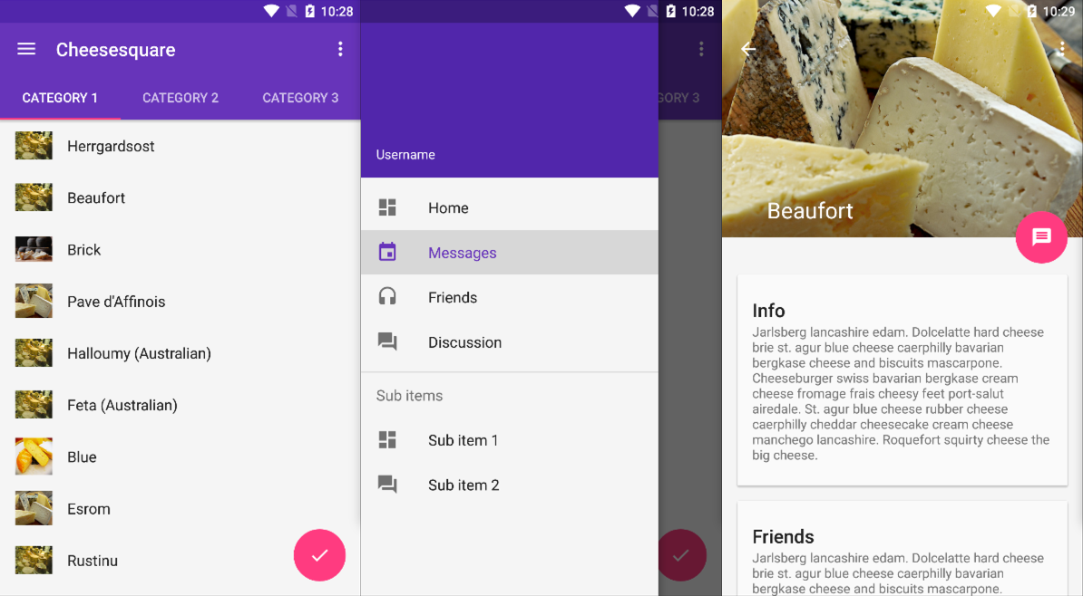 cheesesquare是Android開發大神chrisbanes所作,用以展示全新的Android Desgin Support Library,其實就是Android幫我們新造的一些輪子,主要演示以下輪子的使用技巧: