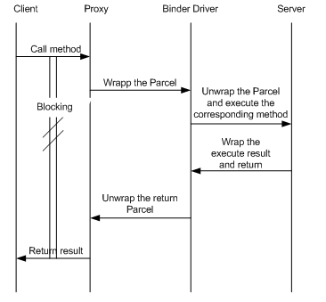從圖中我們可以看出,Client, Server, ServiceManager運行在系統的用戶態,而Binder Driver運行在內核態。為了完成Client端到Server端的通信任務,用戶空間的需要操作Binder Driver提供的/dev/binder文件來完成交互。那麼ServiceManager的工作是什麼呢?ServiceManager負責管理Server並向Client端提供一個Server的代理接口(proxy)。通過代理接口中定義的方法,Client端就可以使用Server端提供的服務了。整個過程如下: