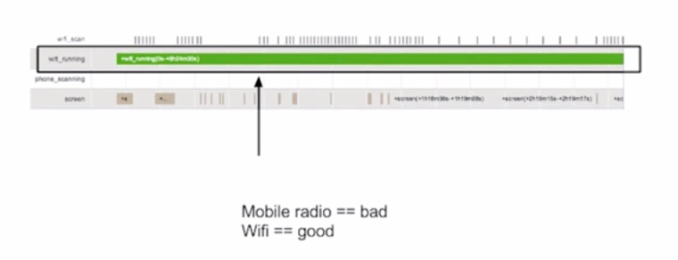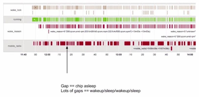通過前面學習到的Battery Historian我們可以得到設備的電量消耗數據,如果數據中的移動蜂窩網絡(Mobile Radio)電量消耗呈現下面的情況,間隔很小,又頻繁斷斷續續的出現,說明電量消耗性能很不好: