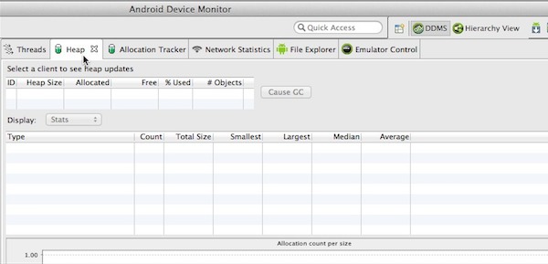 另一個能夠幫助你收集更新關於內存洩漏信息和其他內存相關問題的工具是Android Device Monitor的DDMMS工具下的Heap。