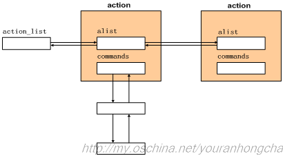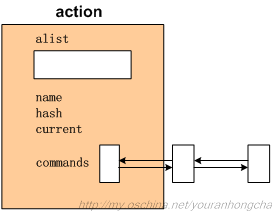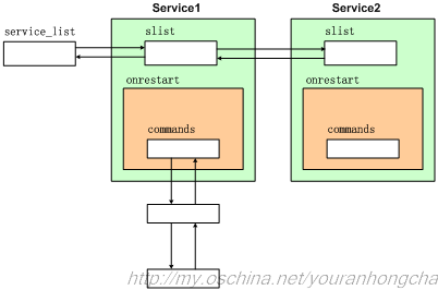 在Android系統中,會有個init.rc腳本。Init進程一啟動就會讀取並解析這個腳本文件,把其中的元素整理成自己的數據結構(鏈表)。具體情況可參考system\core\init\init.c文件,它的main()函數會先調用init_parse_config_file(“/init.rc”)來解析init.rc腳本,分析出應該執行的語義,並且把腳本中描述的action和service信息分別組織成雙向鏈表,然後執行之。示意圖如下: