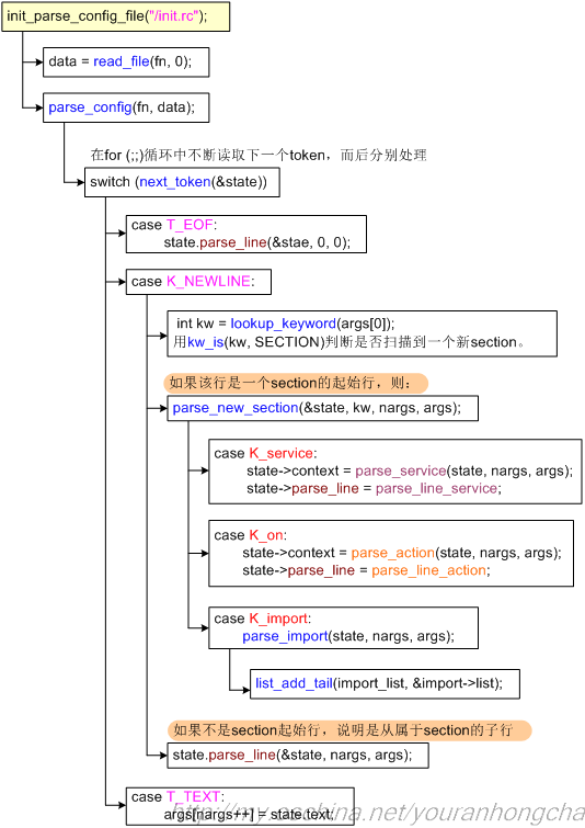 在init進程的main()函數裡,會調用init_parse_config_file(“/init.rc”)一句來解析init.rc腳本。init_parse_config_file()的代碼如下: