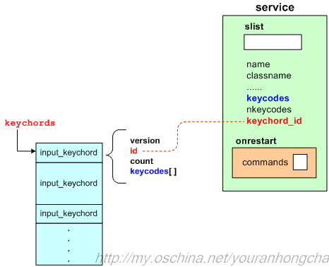 keychord信息裡有個唯一的id號,而且這個id號還會回寫到service節點的keychord_id域。 經過這次遍歷,我們大體上可以畫出下面這樣的示意圖: