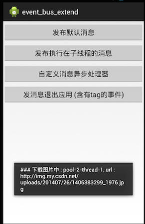 圖1中,事件接收函數就執行在異步線程。通過這幾個線程模型,我們就可以定制接收函數的執行線程。這樣我們就可以使用AndroidEventBus做很多事了。比如發布一個事件,在這個事件接收函數中進行耗時操作;或下載圖片、進行HTTP請求、I/O操作等,以及替換Thread、AsyncTask等組件。不過,AndroidEventBus的功能遠不止於此,下面我們就看看如何進行更高端的操作。