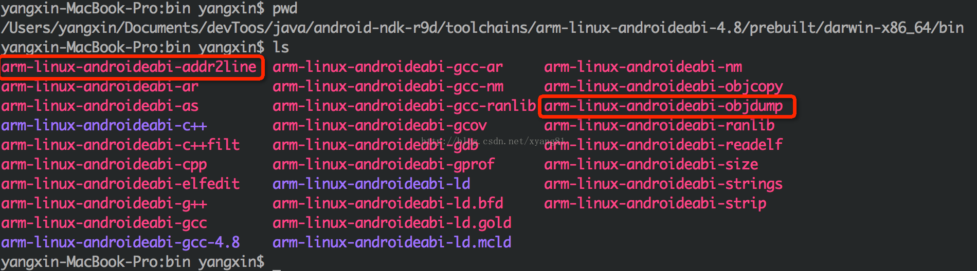 /Users/yangxin/Documents/devToos/java/android-ndk-r9d/toolchains/arm-linux-androideabi-4.8/prebuilt/darwin-x86_64/bin/arm-linux-androideabi-objdump -S -D /Users/yangxin/Documents/devToos/java/android-ndk-r9d/samples/hello-jni/obj/local/armeabi-v7a/libhello-jni.so > Users/yangxin/Desktop/dump.log