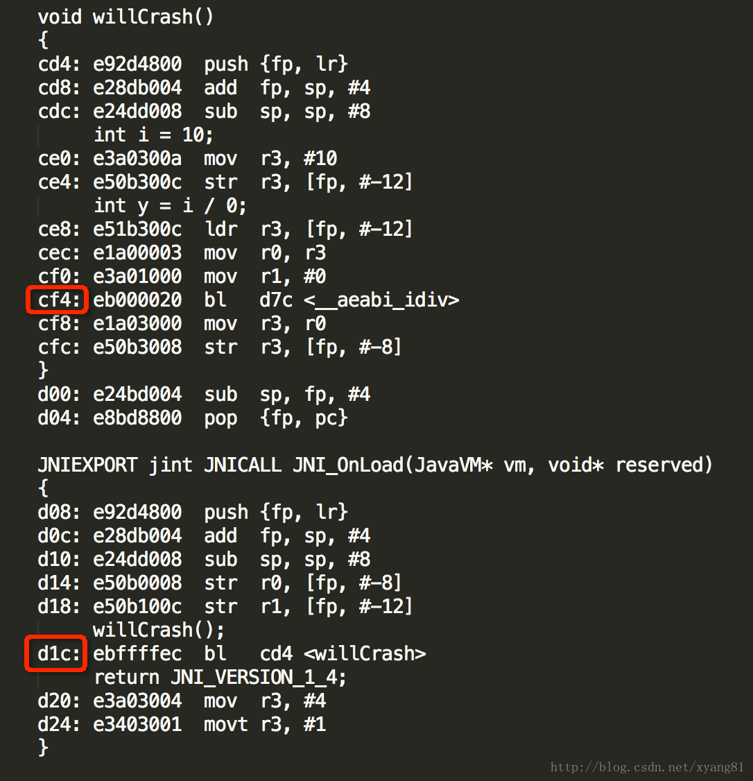 01-01 17:59:38.596: I/DEBUG(253): #04 pc 00000cf4 /data/app-lib/com.example.hellojni-1/libhello-jni.so (willCrash+32) 01-01 17:59:38.596: I/DEBUG(253): #05 pc 00000d1c /data/app-lib/com.example.hellojni-1/libhello-jni.so (JNI_OnLoad+20)