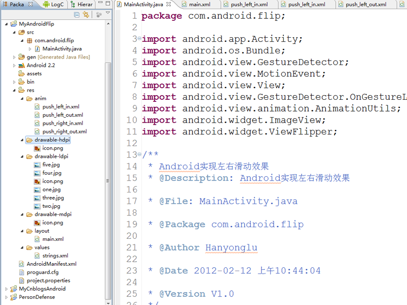 為了使其滑動時有一定的特效,我們需要加入Animation效果,說到Animation,我們先看下如何在Android中實現自定義Animation。自定義的Animation是以XML格式定義的,定義好的XML文件存放在res/anim中。