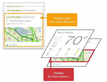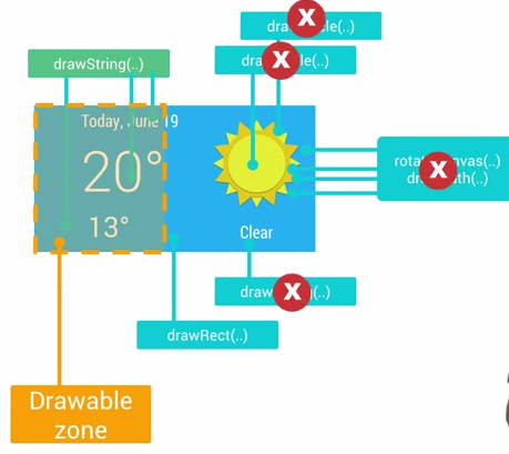 有一個竅門是我們可以通過執行幾個APIs方法來顯著提升繪制操作的性能。前面有提到過,非可見的UI組件進行繪制更新會導致Overdraw。例 如Nav Drawer從前置可見的Activity滑出之後,如果還繼續繪制那些在Nav Drawer裡面不可見的UI組件,這就導致了Overdraw。為了解決這個問題,Android系統會通過避免繪制那些完全不可見的組件來盡量減少 Overdraw。那些Nav Drawer裡面不可見的View就不會被執行浪費資源。