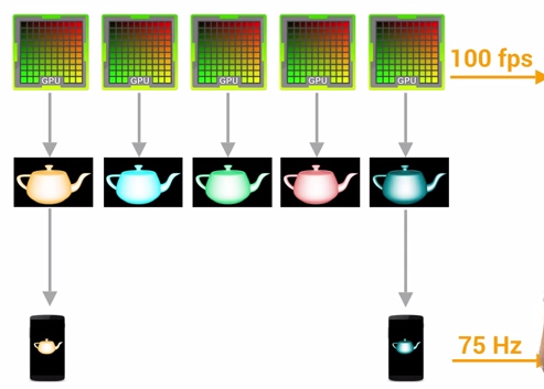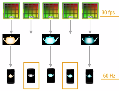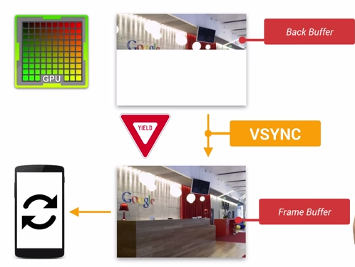 通常來說,幀率超過刷新頻率只是一種理想的狀況,在超過60fps的情況下,GPU所產生的幀數據會因為等待VSYNC的刷新信息而被Hold住,這樣能夠保持每次刷新都有實際的新的數據可以顯示。但是我們遇到更多的情況是幀率小於刷新頻率。