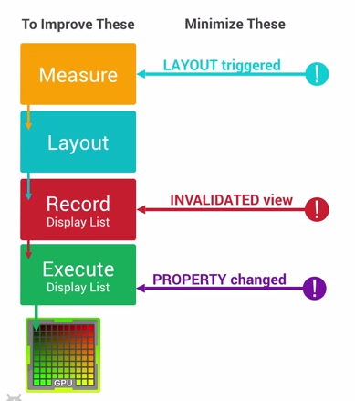 需要注意的是:任何時候View中的繪制內容發生變化時,都會重新執行創建DisplayList,渲染DisplayList,更新到屏幕上等一 系列操作。這個流程的表現性能取決於你的View的復雜程度,View的狀態變化以及渲染管道的執行性能。舉個例子,假設某個Button的大小需要增大 到目前的兩倍,在增大Button大小之前,需要通過父View重新計算並擺放其他子View的位置。修改View的大小會觸發整個 HierarcyView的重新計算大小的操作。如果是修改View的位置則會觸發HierarchView重新計算其他View的位置。如果布局很復 雜,這就會很容易導致嚴重的性能問題。我們需要盡量減少Overdraw。