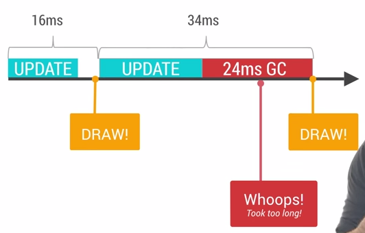 通常來說,單個的GC並不會占用太多時間,但是大量不停的GC操作則會顯著占用幀間隔時間(16ms)。如果在幀間隔時間裡面做了過多的GC操作,那麼自然其他類似計算,渲染等操作的可用時間就變得少了。