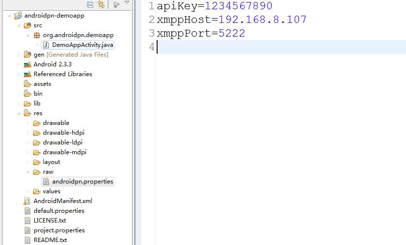 解壓兩個包,Eclipse導入client,配置好目標平台,打開raw/androidpn.properties文件,配置客戶端程序。1. 如果是模擬器來運行客戶端程序,把xmppHost配置成10.0.2.2[模擬器把10.0.2.2認為是所在主機的地 址,127.0.0.1是模擬器本身的回環地址,10.0.2.1表示網關地址,10.0.2.3表示DNS地址,10.0.2.15表示目標設備的網絡 地址],關於模擬器的詳細信息,大家可參閱相關資料,這裡不再詳述.